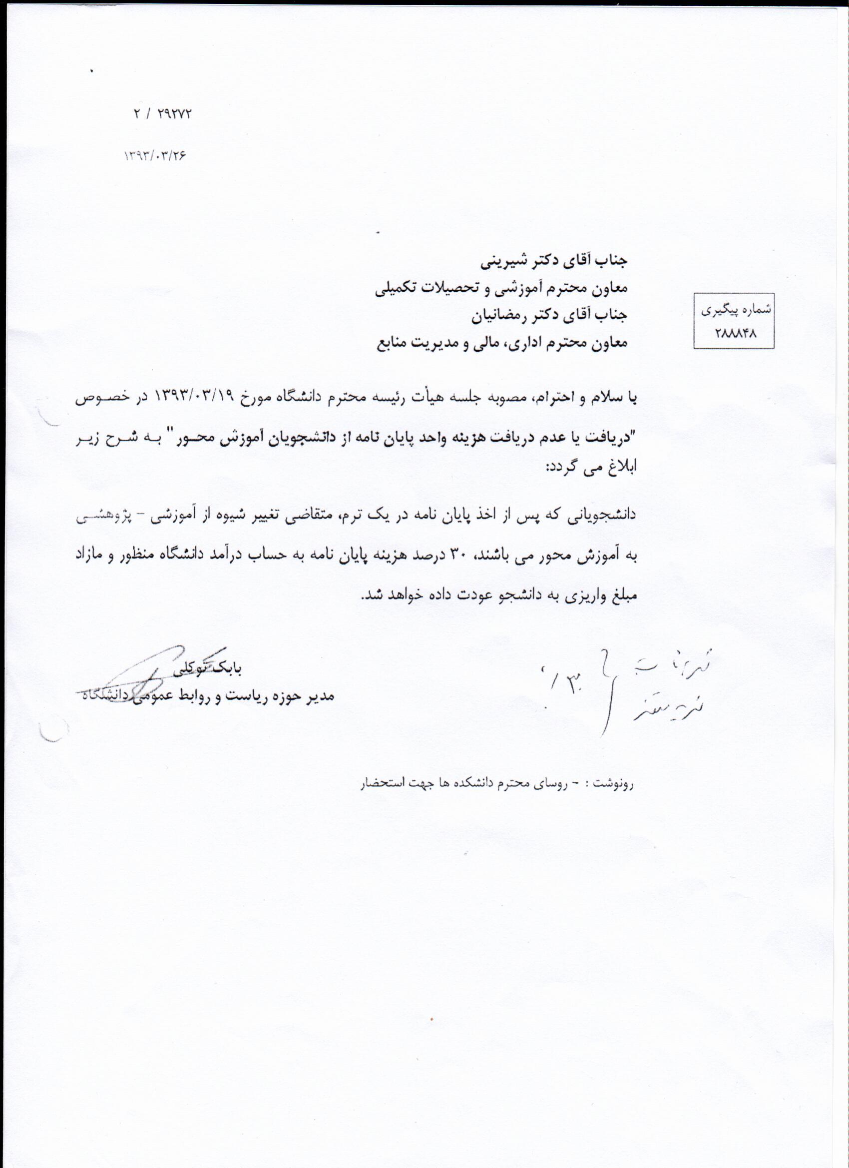 بخشنامه حذف پایان نامه کارشناسی ارشد سال ۹۳