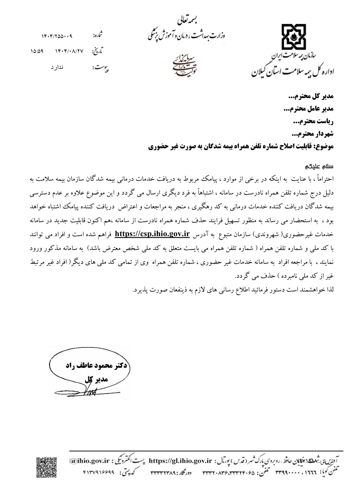 قابلیت اصلاح شماره تلفن همراه بیمه شدگان بیمه سلامت به صورت غیر حضوری